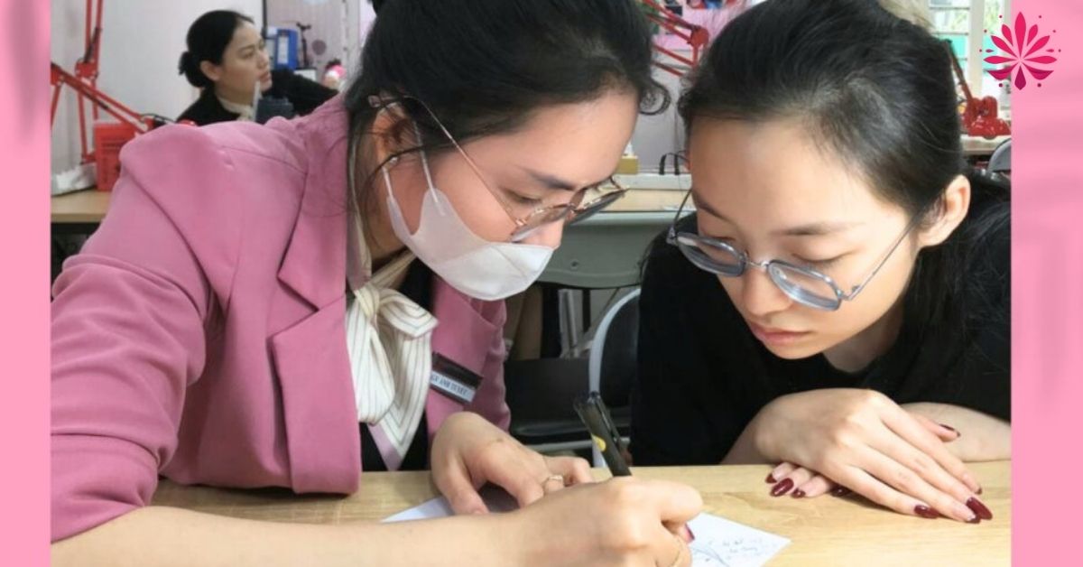 Giảng viên hướng dẫn chi tiết từng bước chi tiết, kèm 1:1. Đồng thời, họ quan sát lực tay, hướng đi sợi để đảm bảo đúng kỹ thuật.