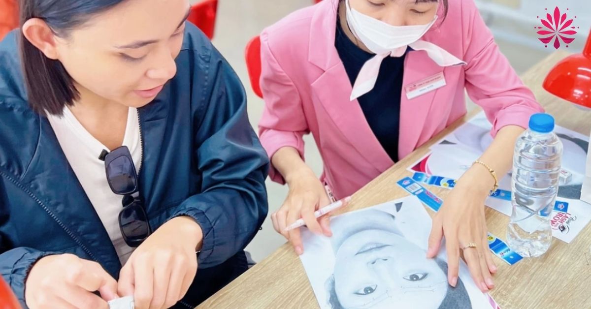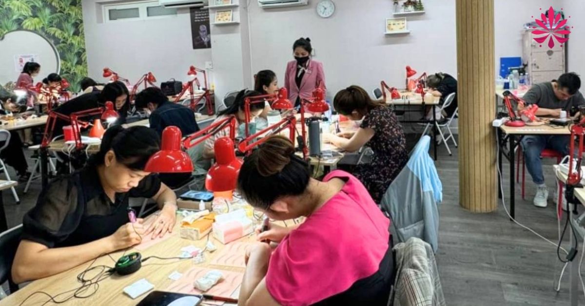 Lớp học thử cung cấp cơ hội làm quen với dụng cụ phun xăm, không gian học tập chuyên nghiệp. Học viên trực tiếp trải nghiệm kỹ năng kéo sợi cơ bản và vẽ dáng mày tự nhiên trên da giả.