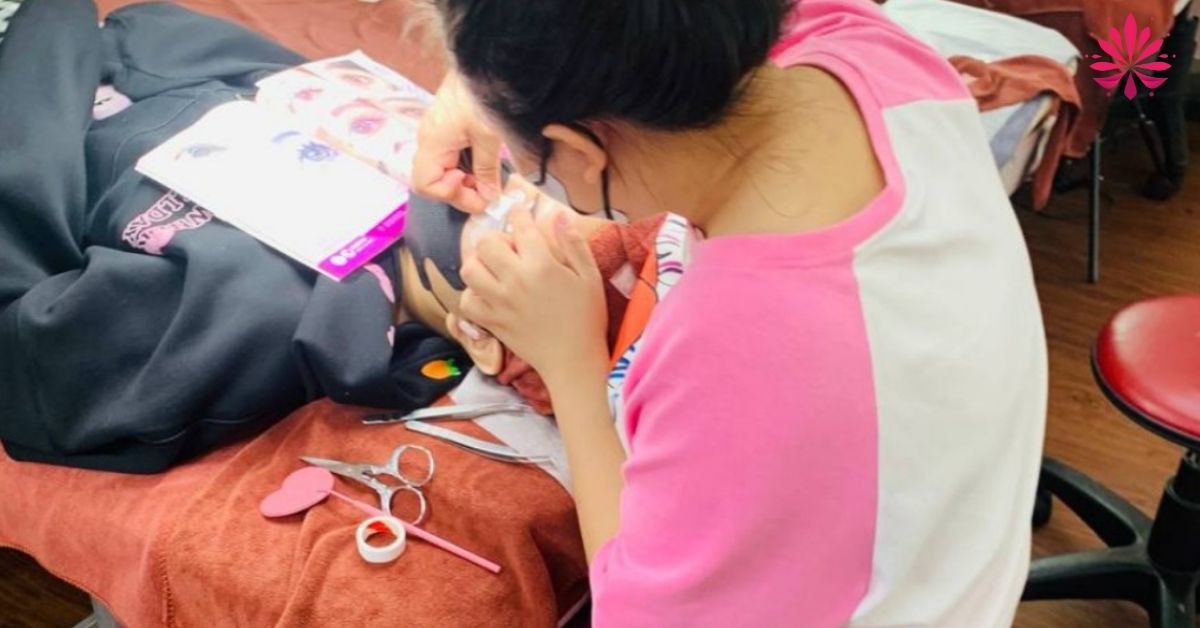 Học viên luyện tay nghề trong Lớp học nối mi cho người mới kèm cặp thực tế